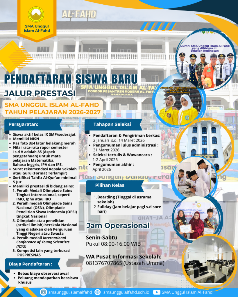 SMA Unggul Islam Al-Fahd secara resmi mengumumkan pembukaan Penerimaan Peserta Didik Baru (PPDB) untuk tahun ajaran mendatang. Sebagai salah satu institusi pendidikan Islam terkemuka yang memadukan kurikulum nasional dengan nilai-nilai religius yang kuat, Al-Fahd kembali memanggil putra-putri terbaik lulusan SMP/sederajat untuk bergabung melalui dua jalur seleksi, yakni Jalur Prestasi dan Jalur Reguler.