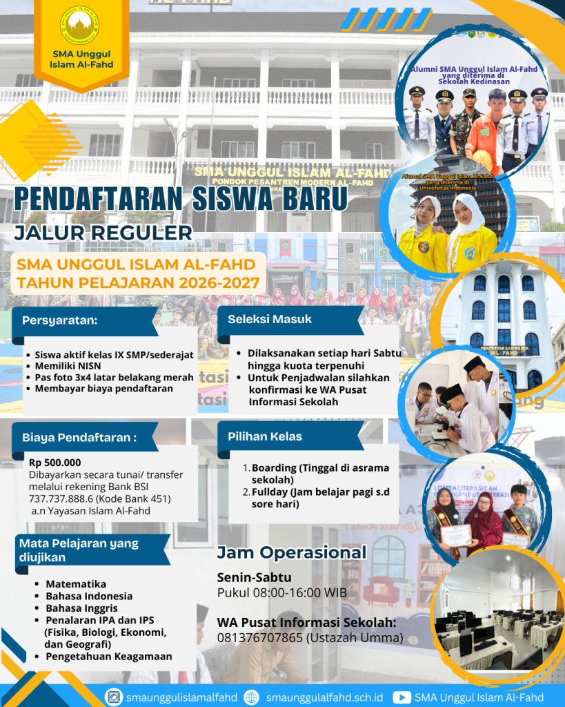 Bagi orang tua dan calon siswa yang ingin mendaftar, proses pendaftaran kini dapat dilakukan secara daring melalui website resmi sekolah atau dengan mengunjungi langsung pusat informasi di kampus SMA Unggul Islam Al-Fahd. Dengan fasilitas pendukung yang lengkap dan program unggulan yang variatif, Al-Fahd siap menjadi jembatan bagi para siswa menuju perguruan tinggi impian mereka.